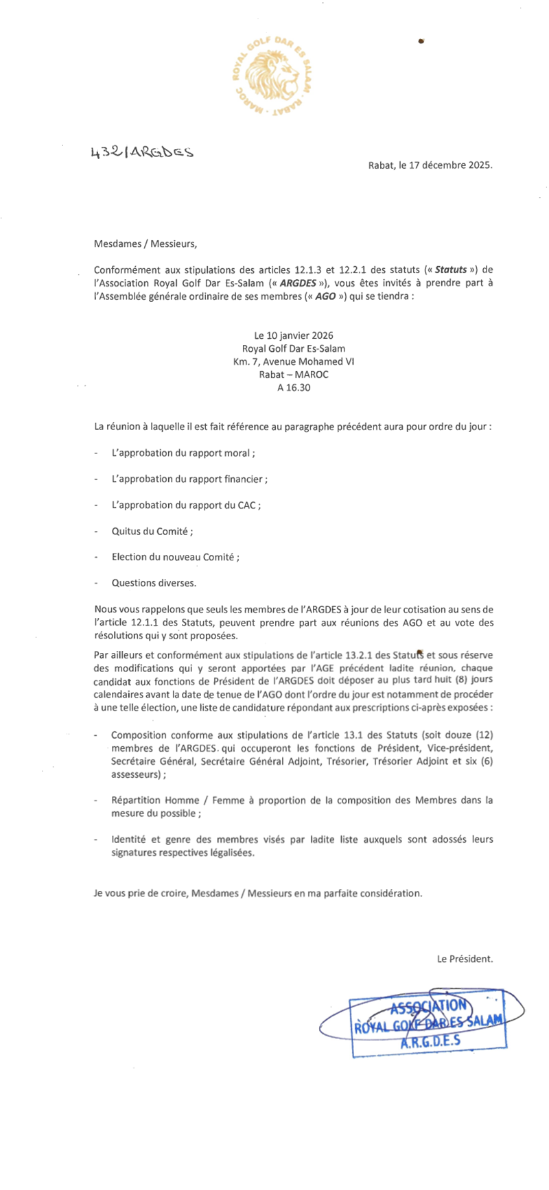 Convocation à l’AGO du 10 Janvier 2026jeudi 18 décembre 2025